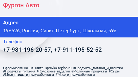 Фургон-Авто по адресу 196626, Россия, Санкт-Петербург, Школьная, 59в в дальнейшем Организация, размещена в следующих категориях: