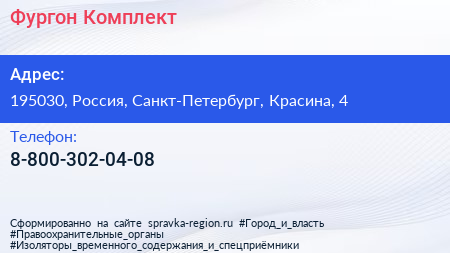 Фургон-Комплект по адресу 195030, Россия, Санкт-Петербург, Красина, 4 в дальнейшем Организация, размещена в следующих категориях: