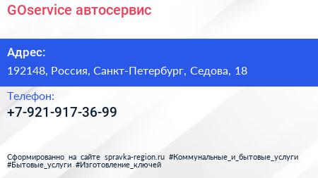 GOservice, автосервис по адресу 192148, Россия, Санкт-Петербург, Седова, 18 в дальнейшем Организация, размещена в следующих категориях: