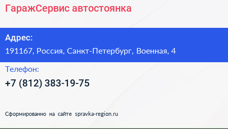 ГаражСервис, автостоянка по адресу 191167, Россия, Санкт-Петербург, Военная, 4 в дальнейшем Организация, размещена в следующих категориях: