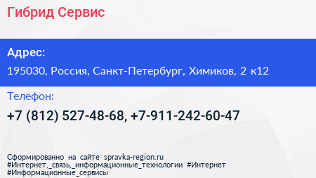 Гибрид Сервис по адресу 195030, Россия, Санкт-Петербург, Химиков, 2 к12 в дальнейшем Организация, размещена в следующих категориях: