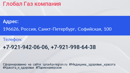 Глобал Газ, компания по адресу 196626, Россия, Санкт-Петербург, Софийская, 100 в дальнейшем Организация, размещена в следующих категориях: