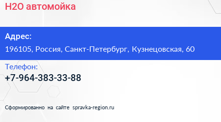 H2O, автомойка по адресу 196105, Россия, Санкт-Петербург, Кузнецовская, 60 в дальнейшем Организация, размещена в следующих категориях: