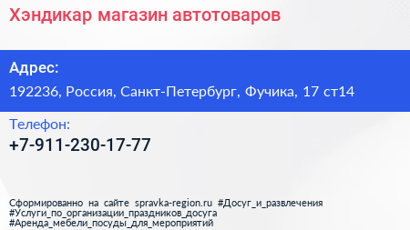 Хэндикар, магазин автотоваров по адресу 192236, Россия, Санкт-Петербург, Фучика, 17 ст14 в дальнейшем Организация, размещена в следующих категориях: