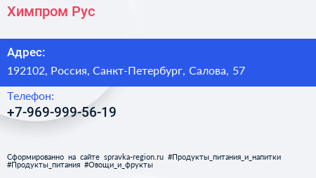 Химпром-Рус по адресу 192102, Россия, Санкт-Петербург, Салова, 57 в дальнейшем Организация, размещена в следующих категориях:
