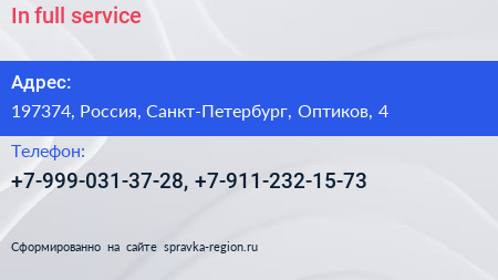 In full service по адресу 197374, Россия, Санкт-Петербург, Оптиков, 4 в дальнейшем Организация, размещена в следующих категориях: