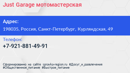 Just Garage, мотомастерская по адресу 198035, Россия, Санкт-Петербург, Курляндская, 49 в дальнейшем Организация, размещена в следующих категориях: