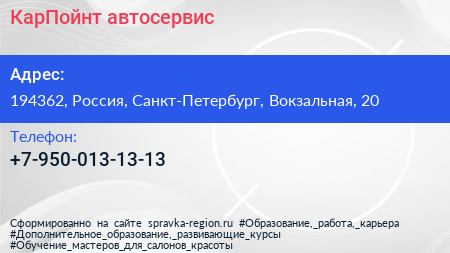 КарПойнт, автосервис по адресу 194362, Россия, Санкт-Петербург, Вокзальная, 20 в дальнейшем Организация, размещена в следующих категориях: