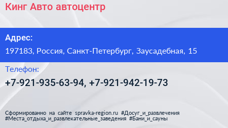 Кинг-Авто, автоцентр по адресу 197183, Россия, Санкт-Петербург, Заусадебная, 15 в дальнейшем Организация, размещена в следующих категориях: