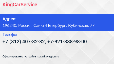 KingCarService по адресу 196240, Россия, Санкт-Петербург, Кубинская, 77 в дальнейшем Организация, размещена в следующих категориях: