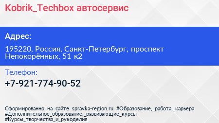 Kobrik_Techbox, автосервис по адресу 195220, Россия, Санкт-Петербург, проспект Непокорённых, 51 к2 в дальнейшем Организация, размещена в следующих категориях: