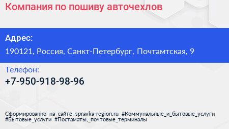 Компания по пошиву авточехлов по адресу 190121, Россия, Санкт-Петербург, Почтамтская, 9 в дальнейшем Организация, размещена в следующих категориях: