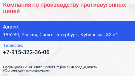 Компания по производству противоугонных цепей по адресу 196240, Россия, Санкт-Петербург, Кубинская, 82 к1 в дальнейшем Организация, размещена в следующих категориях:
