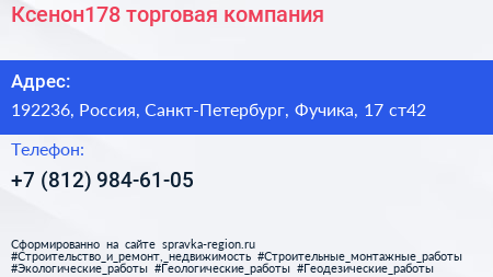 Ксенон178, торговая компания по адресу 192236, Россия, Санкт-Петербург, Фучика, 17 ст42 в дальнейшем Организация, размещена в следующих категориях: