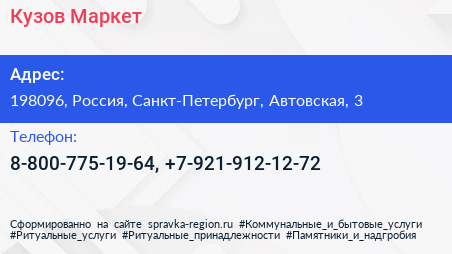 Кузов Маркет по адресу 198096, Россия, Санкт-Петербург, Автовская, 3 в дальнейшем Организация, размещена в следующих категориях: