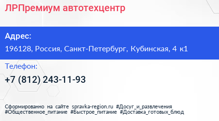 ЛРПремиум, автотехцентр по адресу 196128, Россия, Санкт-Петербург, Кубинская, 4 к1 в дальнейшем Организация, размещена в следующих категориях: