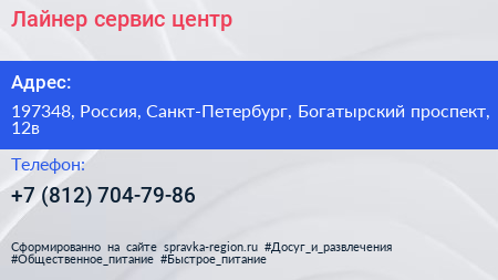 Лайнер, сервис-центр по адресу 197348, Россия, Санкт-Петербург, Богатырский проспект, 12в в дальнейшем Организация, размещена в следующих категориях: