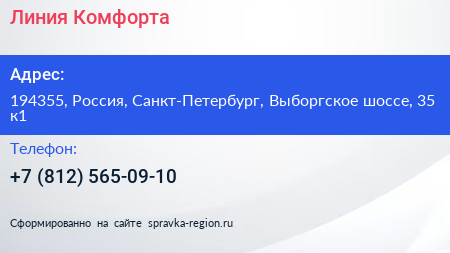 Линия Комфорта по адресу 194355, Россия, Санкт-Петербург, Выборгское шоссе, 35 к1 в дальнейшем Организация, размещена в следующих категориях: