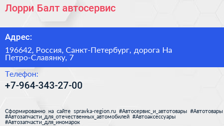Лорри Балт, автосервис по адресу 196642, Россия, Санкт-Петербург, дорога На Петро-Славянку, 7 в дальнейшем Организация, размещена в следующих категориях: