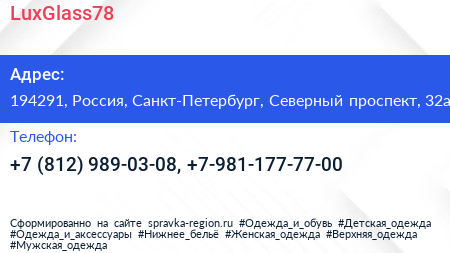 LuxGlass78 по адресу 194291, Россия, Санкт-Петербург, Северный проспект, 32а в дальнейшем Организация, размещена в следующих категориях:
