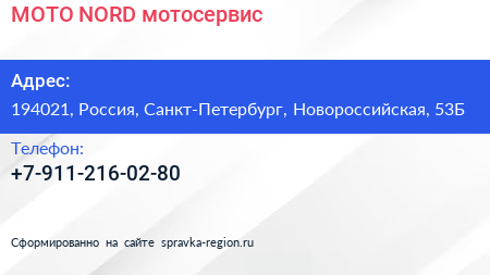 MOTO-NORD, мотосервис по адресу 194021, Россия, Санкт-Петербург, Новороссийская, 53Б в дальнейшем Организация, размещена в следующих категориях: