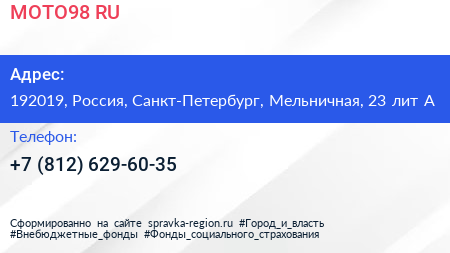 MOTO98.RU по адресу 192019, Россия, Санкт-Петербург, Мельничная, 23 лит А в дальнейшем Организация, размещена в следующих категориях: