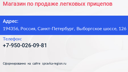 Магазин по продаже легковых прицепов по адресу 194356, Россия, Санкт-Петербург, Выборгское шоссе, 126 в дальнейшем Организация, размещена в следующих категориях: