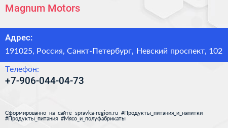 Magnum Motors по адресу 191025, Россия, Санкт-Петербург, Невский проспект, 102 в дальнейшем Организация, размещена в следующих категориях: