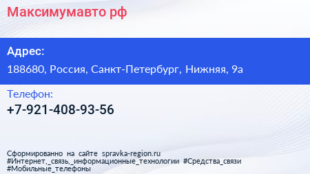 Максимумавто.рф по адресу 188680, Россия, Санкт-Петербург, Нижняя, 9а в дальнейшем Организация, размещена в следующих категориях: