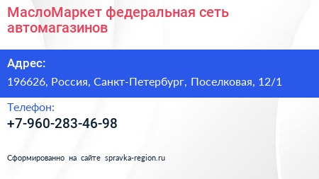 МаслоМаркет, федеральная сеть автомагазинов по адресу 196626, Россия, Санкт-Петербург, Поселковая, 12/1 в дальнейшем Организация, размещена в следующих категориях: