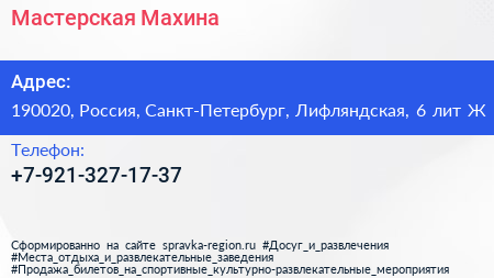 Мастерская Махина по адресу 190020, Россия, Санкт-Петербург, Лифляндская, 6 лит Ж в дальнейшем Организация, размещена в следующих категориях: