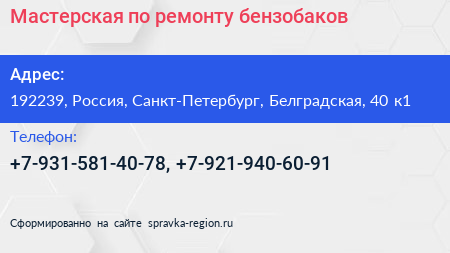 Мастерская по ремонту бензобаков по адресу 192239, Россия, Санкт-Петербург, Белградская, 40 к1 в дальнейшем Организация, размещена в следующих категориях:
