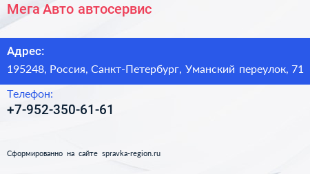 Мега-Авто, автосервис по адресу 195248, Россия, Санкт-Петербург, Уманский переулок, 71 в дальнейшем Организация, размещена в следующих категориях: