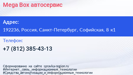 Mega Box, автосервис по адресу 192236, Россия, Санкт-Петербург, Софийская, 8 к1 в дальнейшем Организация, размещена в следующих категориях:
