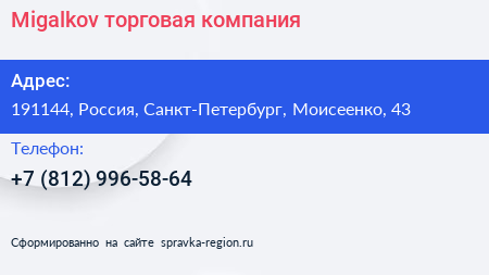 Migalkov, торговая компания по адресу 191144, Россия, Санкт-Петербург, Моисеенко, 43 в дальнейшем Организация, размещена в следующих категориях: