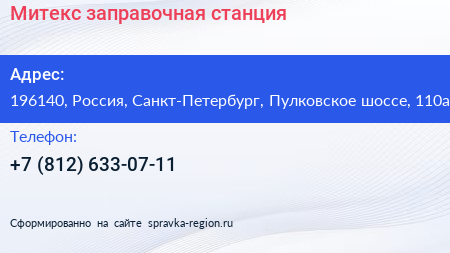 Митекс, заправочная станция по адресу 196140, Россия, Санкт-Петербург, Пулковское шоссе, 110а в дальнейшем Организация, размещена в следующих категориях: