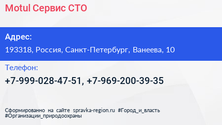 Motul Сервис, СТО по адресу 193318, Россия, Санкт-Петербург, Ванеева, 10 в дальнейшем Организация, размещена в следующих категориях: