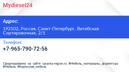 Mydiesel24 по адресу 192102, Россия, Санкт-Петербург, Витебская Сортировочная, 2/1 в дальнейшем Организация, размещена в следующих категориях:
