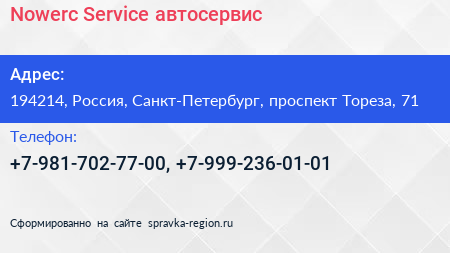 Nowerc Service, автосервис по адресу 194214, Россия, Санкт-Петербург, проспект Тореза, 71 в дальнейшем Организация, размещена в следующих категориях: