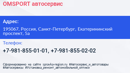 OMSPORT, автосервис по адресу 195067, Россия, Санкт-Петербург, Екатерининский проспект, 5а в дальнейшем Организация, размещена в следующих категориях: