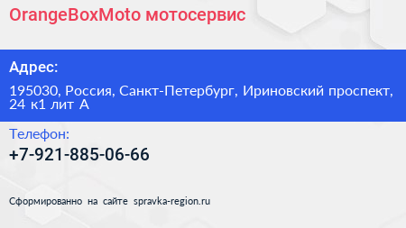 OrangeBoxMoto, мотосервис по адресу 195030, Россия, Санкт-Петербург, Ириновский проспект, 24 к1 лит А в дальнейшем Организация, размещена в следующих категориях: