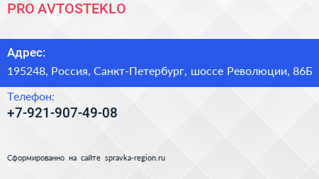 PRO-AVTOSTEKLO по адресу 195248, Россия, Санкт-Петербург, шоссе Революции, 86Б в дальнейшем Организация, размещена в следующих категориях: