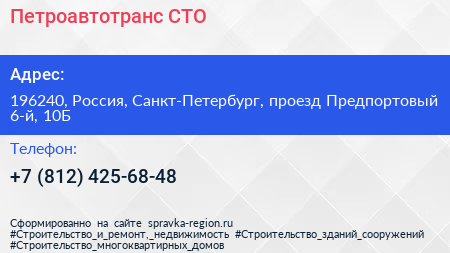 Петроавтотранс, СТО по адресу 196240, Россия, Санкт-Петербург, проезд Предпортовый 6-й, 10Б в дальнейшем Организация, размещена в следующих категориях:
