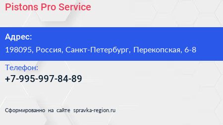 Pistons Pro Service по адресу 198095, Россия, Санкт-Петербург, Перекопская, 6-8 в дальнейшем Организация, размещена в следующих категориях:
