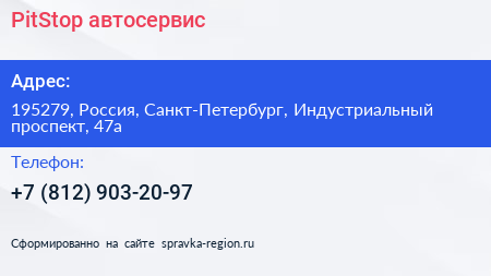 PitStop, автосервис по адресу 195279, Россия, Санкт-Петербург, Индустриальный проспект, 47а в дальнейшем Организация, размещена в следующих категориях: