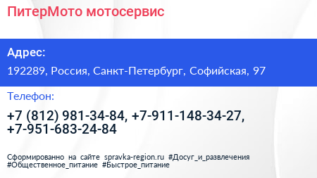 ПитерМото, мотосервис по адресу 192289, Россия, Санкт-Петербург, Софийская, 97 в дальнейшем Организация, размещена в следующих категориях: