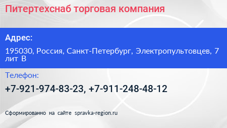 Питертехснаб, торговая компания по адресу 195030, Россия, Санкт-Петербург, Электропультовцев, 7 лит В в дальнейшем Организация, размещена в следующих категориях: