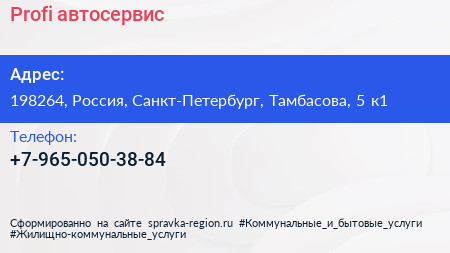Profi, автосервис по адресу 198264, Россия, Санкт-Петербург, Тамбасова, 5 к1 в дальнейшем Организация, размещена в следующих категориях: