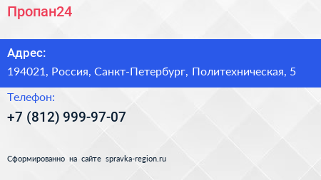 Пропан24 по адресу 194021, Россия, Санкт-Петербург, Политехническая, 5 в дальнейшем Организация, размещена в следующих категориях: