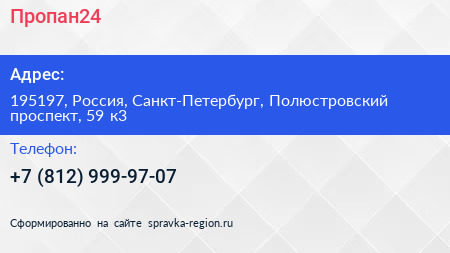 Пропан24 по адресу 195197, Россия, Санкт-Петербург, Полюстровский проспект, 59 к3 в дальнейшем Организация, размещена в следующих категориях: